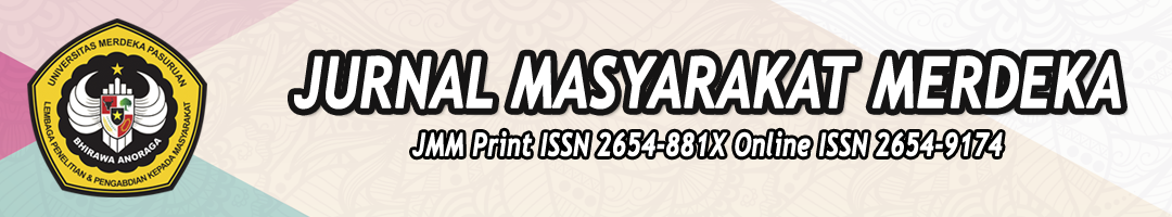 JMM – Jurnal Masyarakat Merdeka adalah Jurnal Pengabdian kepada Masyarakat yang berbasis dari multidisiplin keilmuan, yang diterbitkan oleh LPPM Universitas Merdeka Pasuruan. JMM - Jurnal Pengabdian kepada Masyarakat ini berisi best-practice program-program pengabdian kepada masyarakat dalam berbagai bentuk aksi sosial berupa pendampingan, pelatihan, pemberdayaan, dan bentuk-bentuk lainnya dalam rangka alih pengetahuan dan teknologi pada berbagai komunitas masyarakat guna memecahkan berbagai permasalahan, baik yang bersifat individual maupun kolektif atau berbasis komunitas.